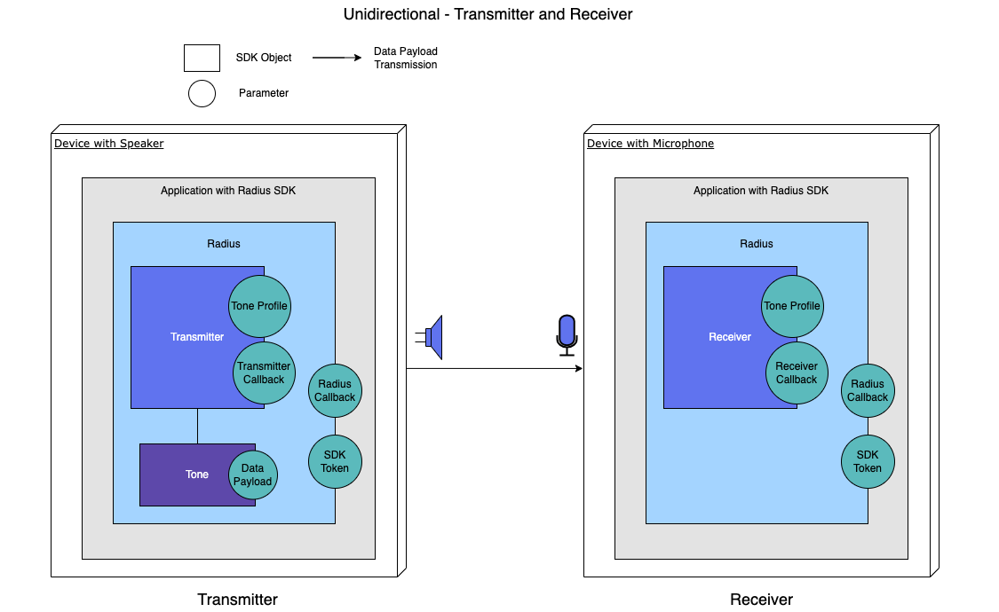 Using the Radius SDK for a unidirectional transaction means you are sending data one way, from the Transmitter to the Receiver. The Transmitter and Receivers either exist within two separate applications (ex. Merchant and Client applications) or in separate sections of the application. When you create a Transmitter or Receiver object, you must supply it with appropriate callbacks (see Callbacks section below) and a tone profile. Callbacks are used similarly to iOS delegates in the Radius SDK which should be noted when referencing the diagram below. Receivers can only receive/demodulate incoming transmissions from Transmitters if they are both created with the same tone profile.